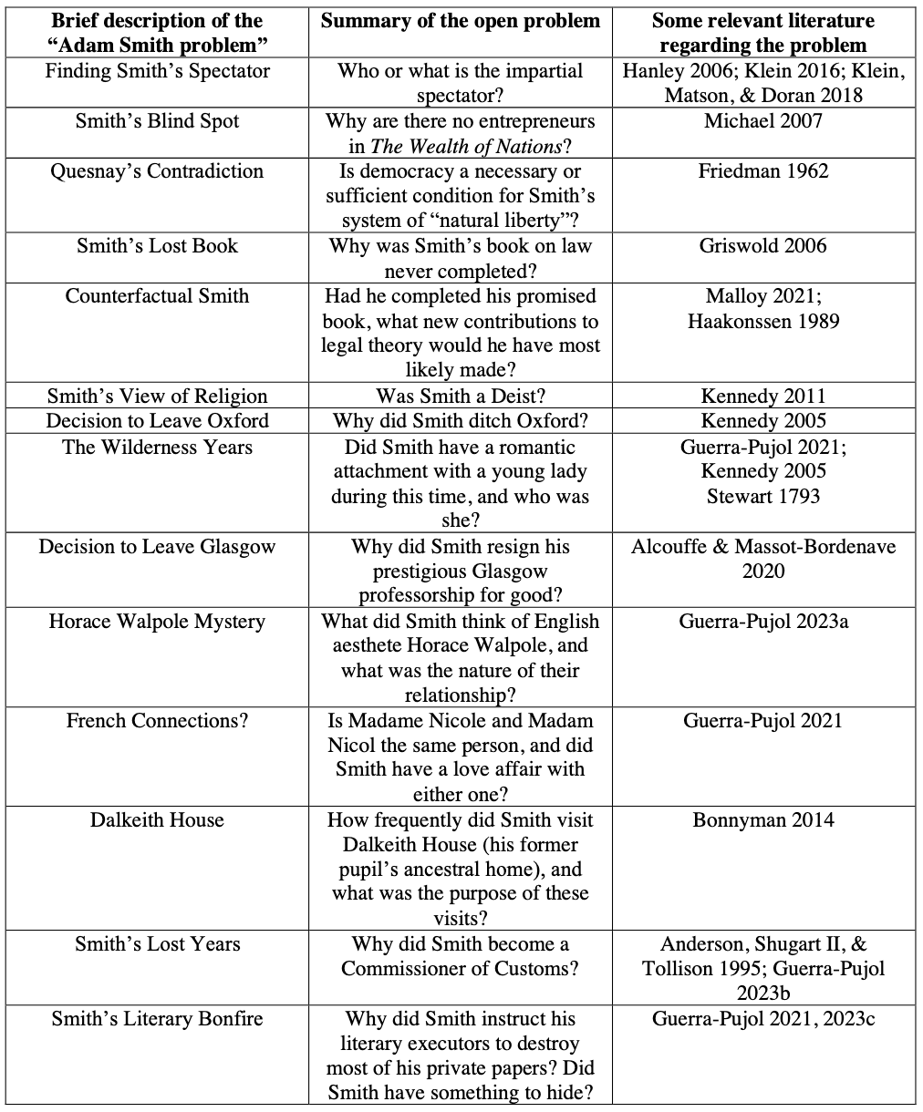 That is the plural of Das Adam Smith Problem as well as the title of my most recent work-in-progress, which I have posted to SSRN (see here). In honor of David Hilbert, the abstract of my paper contains just 23 words: “Besides the original Das Adam Smith Problem of lore, what other aspects of Adam Smith’s life and work remain contested, open, or unsolved?” For your reference, the table pictured below, which appears on page 10 of my paper, pretty much sums up what I have been reading and working on these days:
