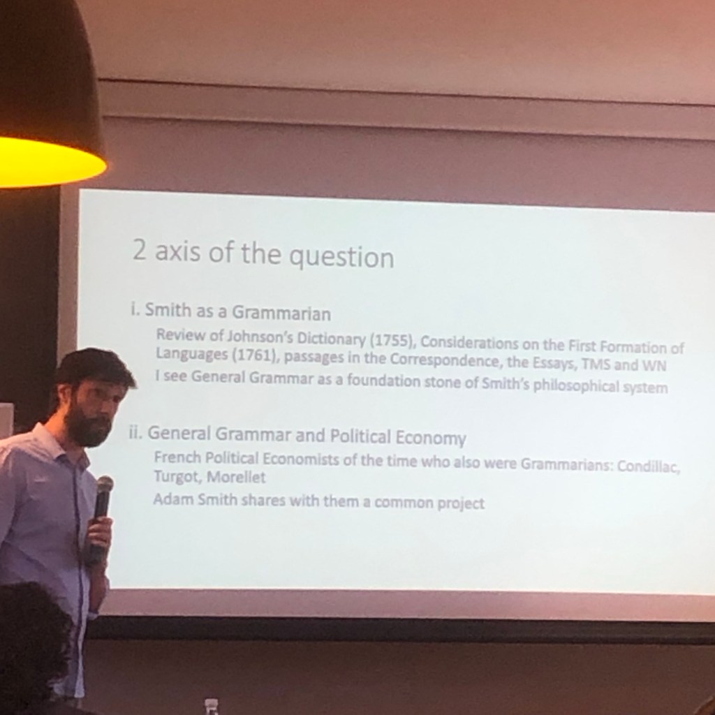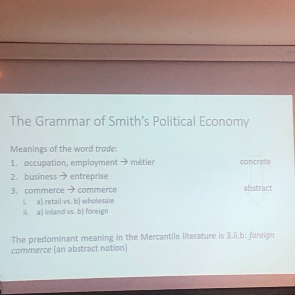 Hola! I am attending a workshop on Adam Smith for young Latin American scholars, and my favorite paper by far was one on “The Meanings of the Word ‘Trade'” by Leonardo André Paes Müller. His paper brought back memories of my favorite paper at the Adam Smith conference in Madison, Wisconsin in 2021: Sarah Skwire’s paper “As If: Clueless about the Invisible Hand.” (See here and here.) Below are two slides from Paes Müller’s talk: