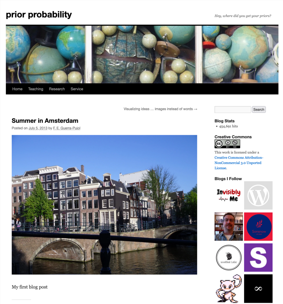 In brief, I began blogging here on 5 July 2013–i.e, nine years and 11 months ago to the day–and to commemorate this occasion, I will from time to time in the next four weeks be reposting some of my favorite blog posts from the last ten years. To get the ball rolling, pictured below is a screenshot of my very first blog post, which features a photograph I took of some bridges, trees, and buildings in one of my favorite cities in the world. Notice too how that post contains only seven words, including the title. Although most blogs consist mostly of words (mine included), one of my goals when I started “Prior Probability” was to convey information and ideas via pictures, charts, and other types of images.