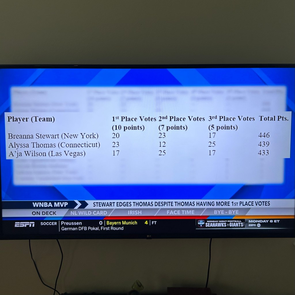 To the point (pun intended), this year’s WNBA MVP award went to Breanna Stewart (who plays for the New York Liberty), even though Alyssa Thomas (Connecticut Sun) had obtained the most first-place votes and A’ja Wilson (Las Vegas Aces) had garnered the most second-place votes!