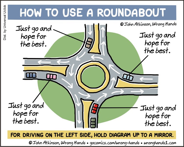 Personally, I prefer roundabouts over stop signs or traffic lights, but my few attempts to navigate them in my neck of the woods (such as this infamous one in Clearwater Beach) have always been frustrating at best, which begs the question, why do so many of my fellow Floridians become paralyzed with fear and indecision whenever they approach a traffic circle? Is it their novelty? That can’t be right: the Clearwater Beach roundabout has been around (pun intended!) for decades. Or is there some inherent flaw in their design? Again, that can’t be right either, since roundabouts work perfectly fine in every other country outside the USA.