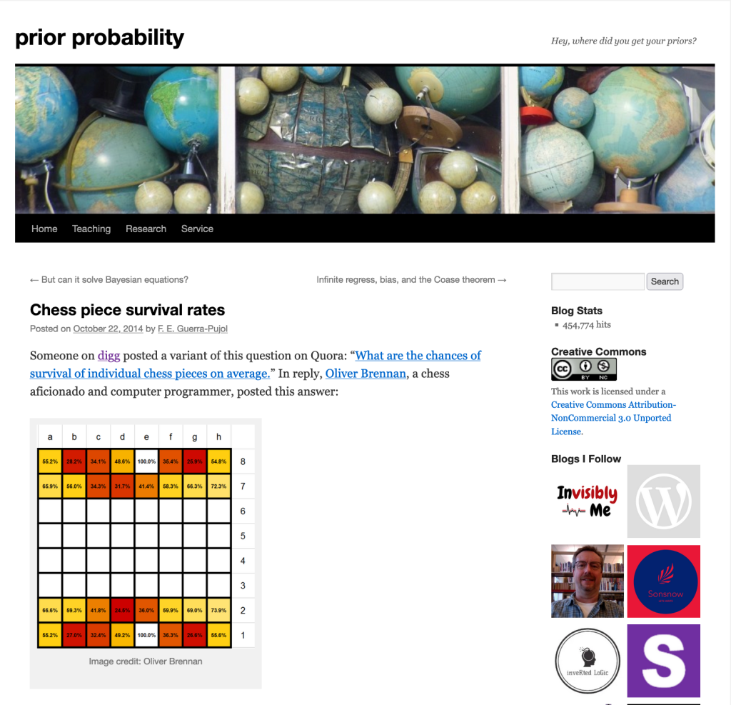 I mentioned in my previous post that this blog is about to turn ten years old and that I will be reposting some of my favorite blog posts from the last ten years to honor this occasion. To wit: I posted “Chess piece survival rates” on 22 October 2014 (see here or screenshot below), and to this day, that pithy blog post turned out to be the most popular one that I have ever posted.