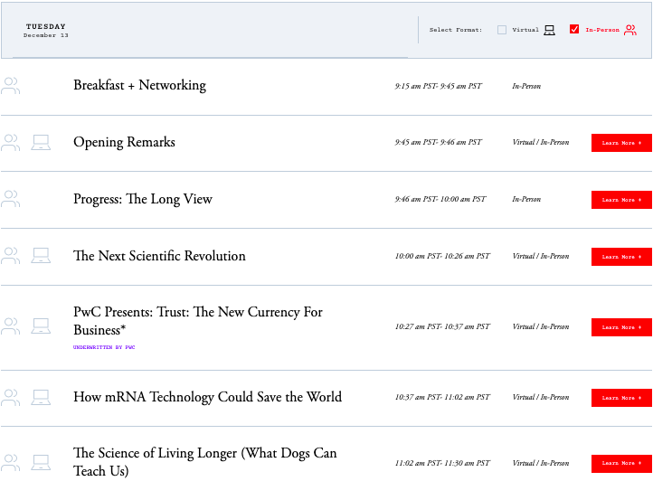 Derek Thompson, a staff writer at The Atlantic (see here) and the host of the “Plain English” podcast (here), has assembled an eclectic group of scientists, entrepreneurs, CEOs, and artists to exchange ideas on a wide variety of topics at a day-long “Progress Summit” in Los Angeles, California on 12/13. I will be attending in person and will report back in the next day or two. In the meantime, pictured below is the first part of the agenda as well as the conference logo. (FYI: The full agenda is available here, and there is also a virtual attendance option.)