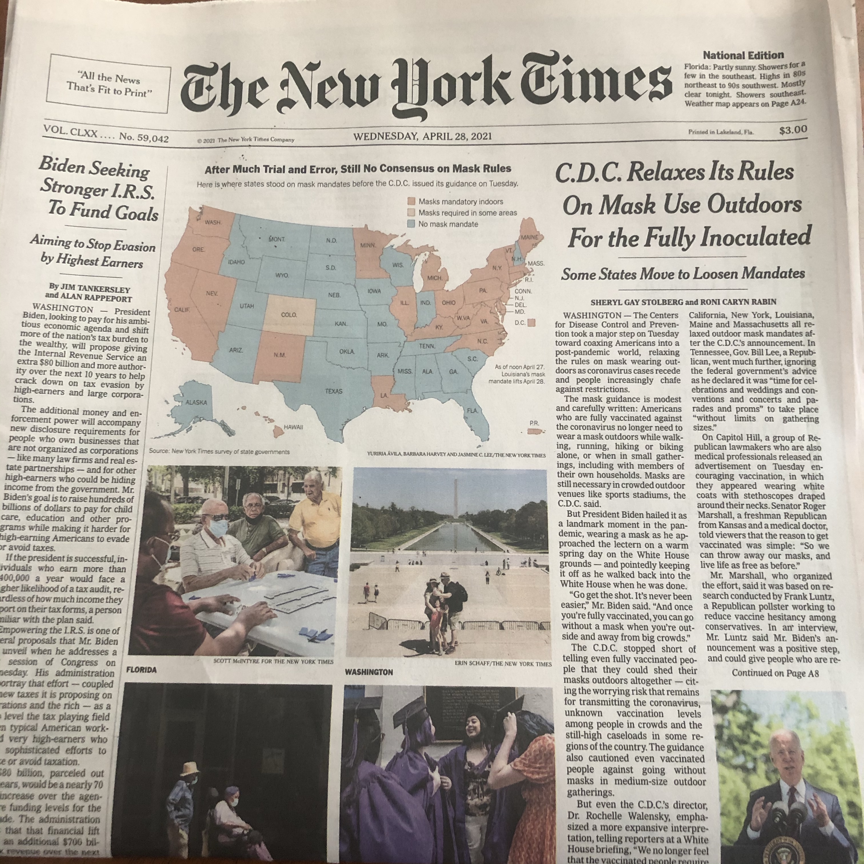 I am interrupting my series of blog posts on wire fraud to say: “I told you so.” My copy of the Wednesday New York Times (pictured below) has this headline above the fold: “CDC Relaxes Its Rules on Mask Use Outdoors for the Fully Inoculated.” That is one small step in the right direction, but as I explain in my work-in-progress on “Lockean Takings” (available here via SSRN), the imposition of mask mandates pales in comparison to the illegal “takings” of labor without the payment of just compensation that occurred across the nation when States ordered “non-essential” workers to stay home last year.